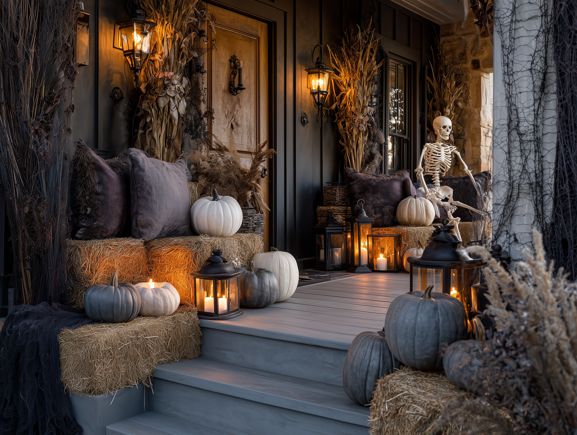 Includes: 1 X-Large Pumpkin, 8 Large Pumpkins, 6 Medium Pumpkins, 6 White Pumpkins, 6 Pie Pumpkins, 14 Mini Pumpkins, 18 Specialty/Gourds, 3 Hay Bales, 2 Skeleton, 2 Skeleton Parts, 8 Stems, a mix of 20 Butterfly/Crow/Spider, 3 Lanterns, 1 Wreath, 3 Specialty “props”.